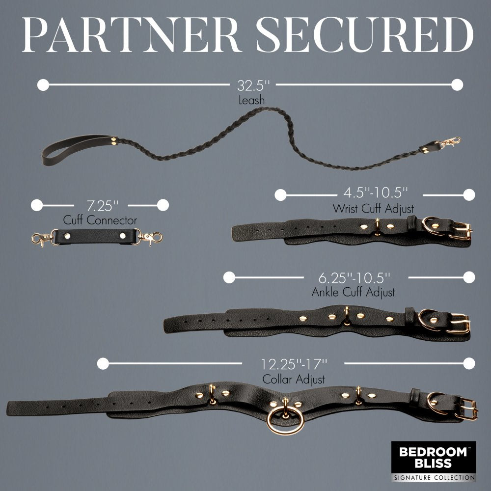• Full, Kinky Set: Includes wrist cuffs, ankle cuffs, a collar with braided leash, and 2 cuff connectors.