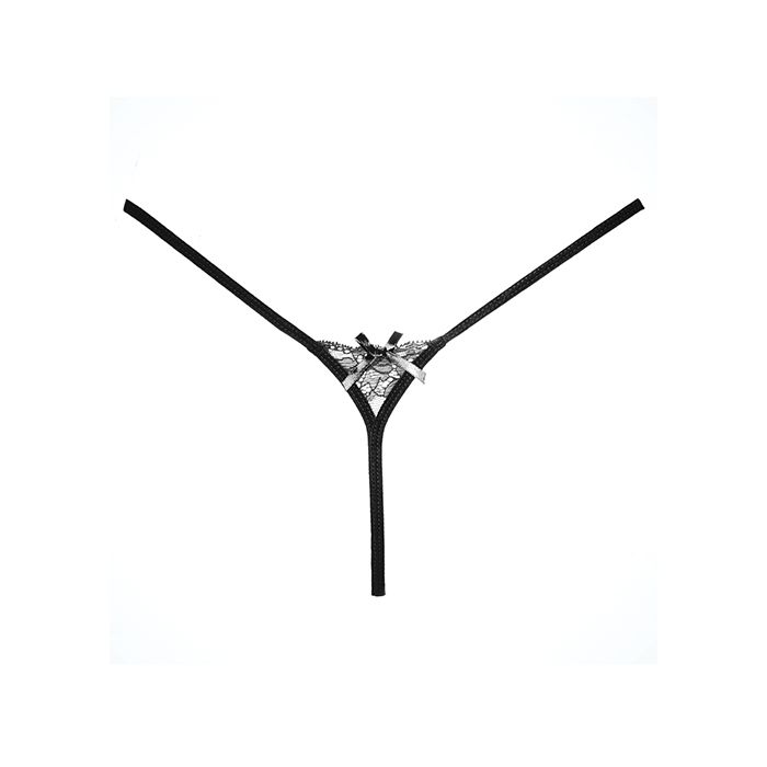 This flirty black panty combines playful elegance with comfort. The sheer asymmetrical lace front panel features delicate scalloped trim and strappy detailing, while satin bow accents add a touch of sophistication. A thin waistband and thong cut back create a sleek silhouette.