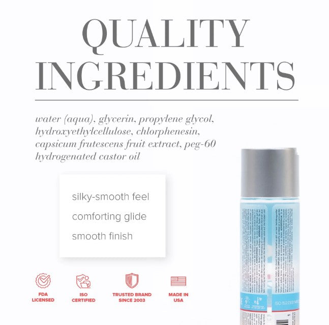 JO H2O Warming is a water-based personal lubricant designed to supplement the body’s natural lubrication. Formulated using a purely plant-based glycerin, this top selling lubricant is designed to provide a silky smooth and comforting glide with no stick or tack residue. Plus, JO H2O is toy friendly, condom compatible and easy to clean. Simply apply and play!