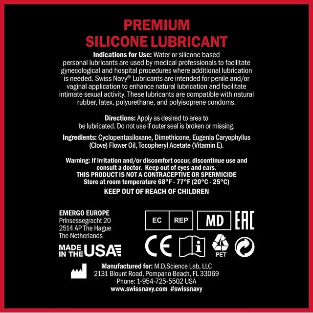 Swiss Navy Silicone is high quality, silicone based, long lasting lubricant which provide a velvety feeling.