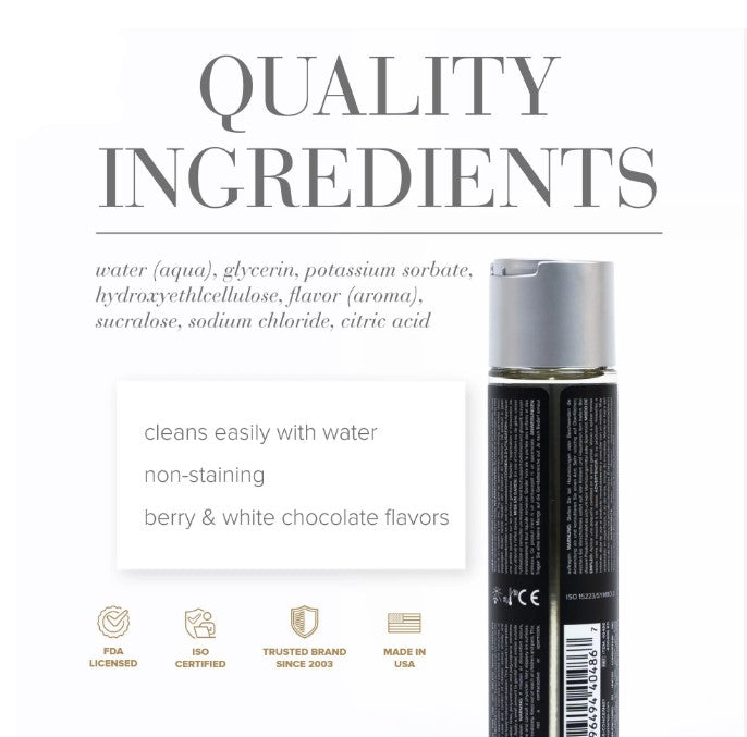 Our Gelato water-based flavored lubricants bring richness and decadence to all types of playtime. Gelato White Chocolate Raspberry Truffle combines lightly tart berries with creamy white chocolate flavors to taste like its luscious dessert inspiration. Its sensual, comforting glide and silky-smooth feel are perfect for any intimate moment, particularly when transitioning from oral to other types of play. And when you’re done, it cleans off easily and leaves your skin feeling soft and moisturized.